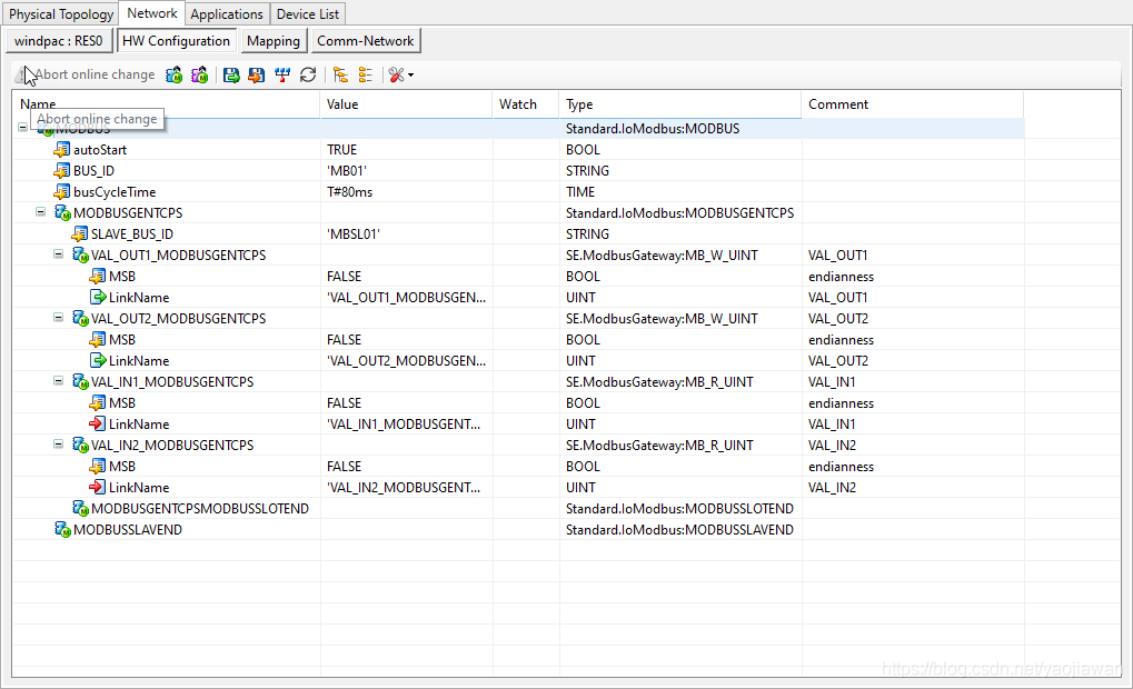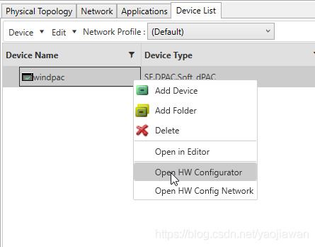 在EAE中(zhong),modbus是作為硬件(jian)功能塊來實(shi)現的(de)。需(xu)要在device List窗口中(zhong),指定設備擊右鍵選擇(ze) HW Configuration.