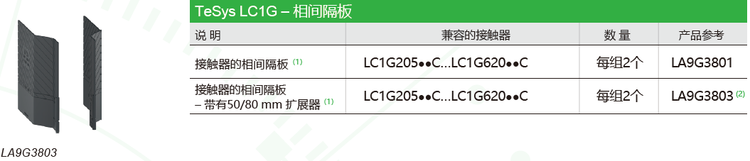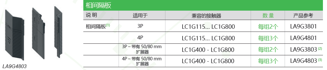 3P 的每(mei)個(ge)(ge)型號(hao)包含(han) 2 個(ge)(ge),4P 的每(mei)個(ge)(ge)型號(hao)包含(han) 3 個(ge)(ge),如果(guo)上下端(duan)(duan)都(dou)(dou)要(yao),則(ze)需要(yao)要(yao)訂(ding)購的數(shu)量(liang)為(wei) 2。舉例:LC1G205 配相間隔板,如果(guo)只(zhi)要(yao)上端(duan)(duan)或者(zhe)下端(duan)(duan),訂(ding) 1 個(ge)(ge) LA9G3801 即(ji)可,如果(guo)上下端(duan)(duan)都(dou)(dou)要(yao)配,則(ze)需要(yao)訂(ding) 2 個(ge)(ge) LA9G3801。