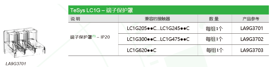 每個型(xing)號(hao)包含 1 個。舉例:LC1G205 配(pei)端(duan)子保護(hu)罩,如果上下端(duan)都要(yao),則需要(yao)配(pei) 2 個 LA9G3701。