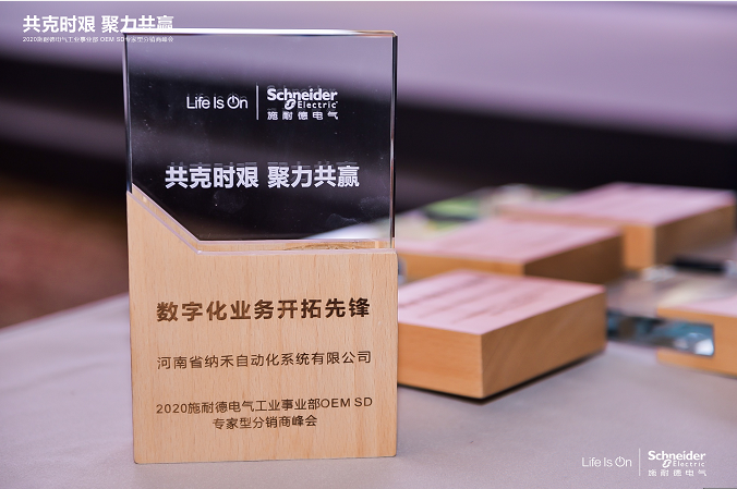 在2020施耐德電氣工(gong)業事業部OEM SD專家型分銷(xiao)商(shang)峰會上(shang),施耐德授予納禾自動(dong)化“數字化業務開拓(tuo)先鋒獎”,在工(gong)業自動(dong)化領域,納禾緊(jin)跟(gen)時代步伐,與(yu)施耐德一道,共克時艱(jian),聚(ju)力共贏!